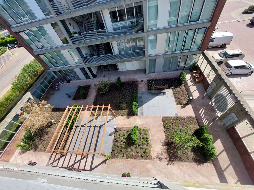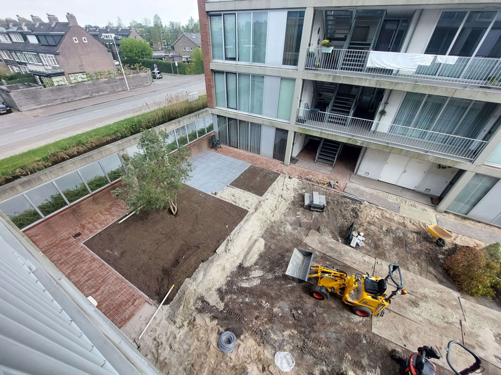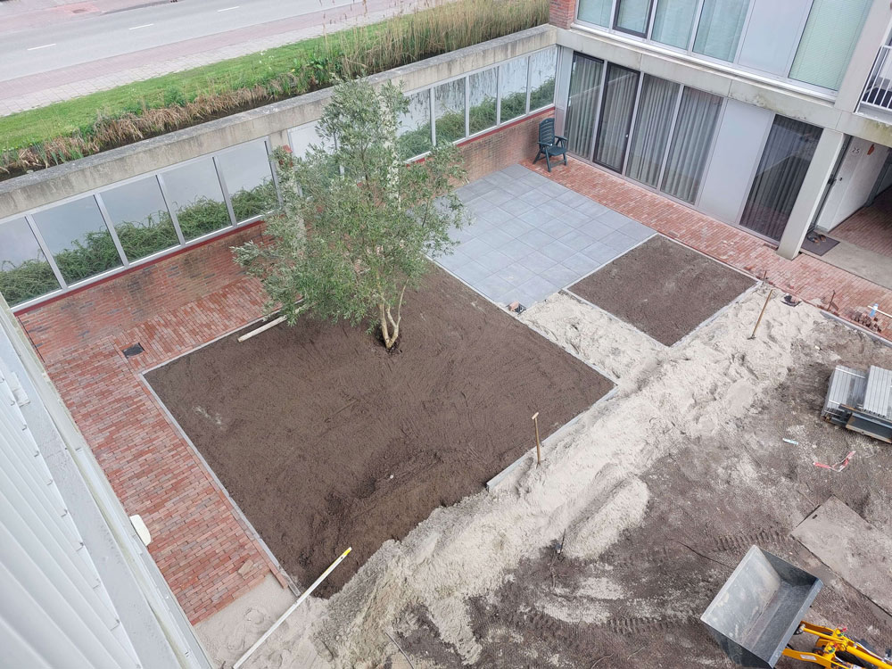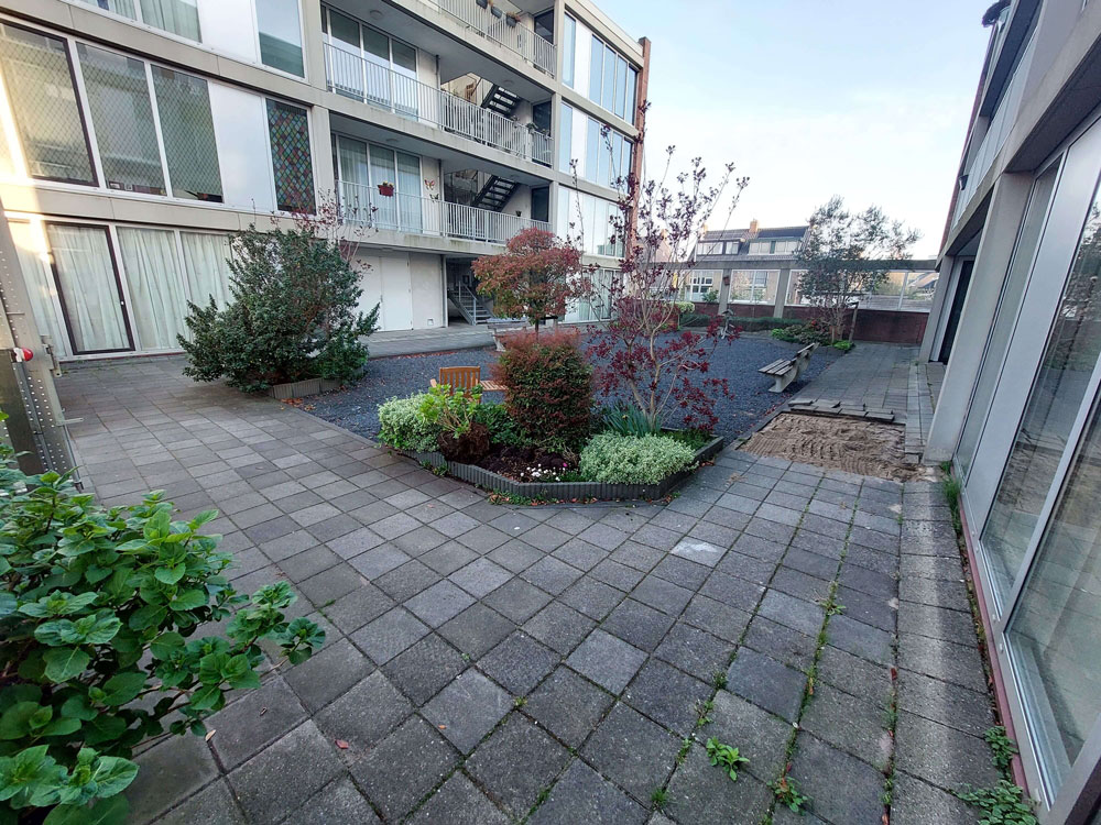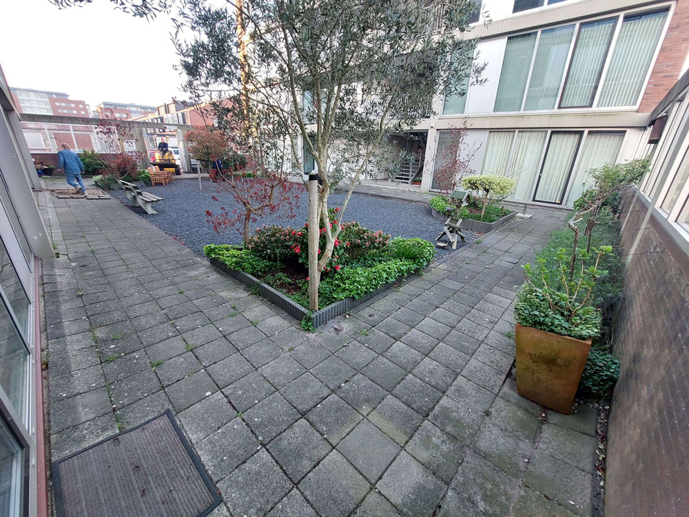 Voor een vaste opdrachtgever heeft Allgroen B.V. de binnentuin van een bestaand wooncomplex volledig gerenoveerd. De oorspronkelijke tuin was sterk verzakt en bood weinig sfeer door de overmaat aan verharding en het beperkte groen. De inrichting bestond voornamelijk uit bestrating en een groot vak met split, aangevuld met enkele kleine groenstroken.