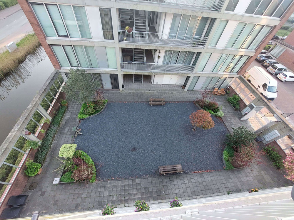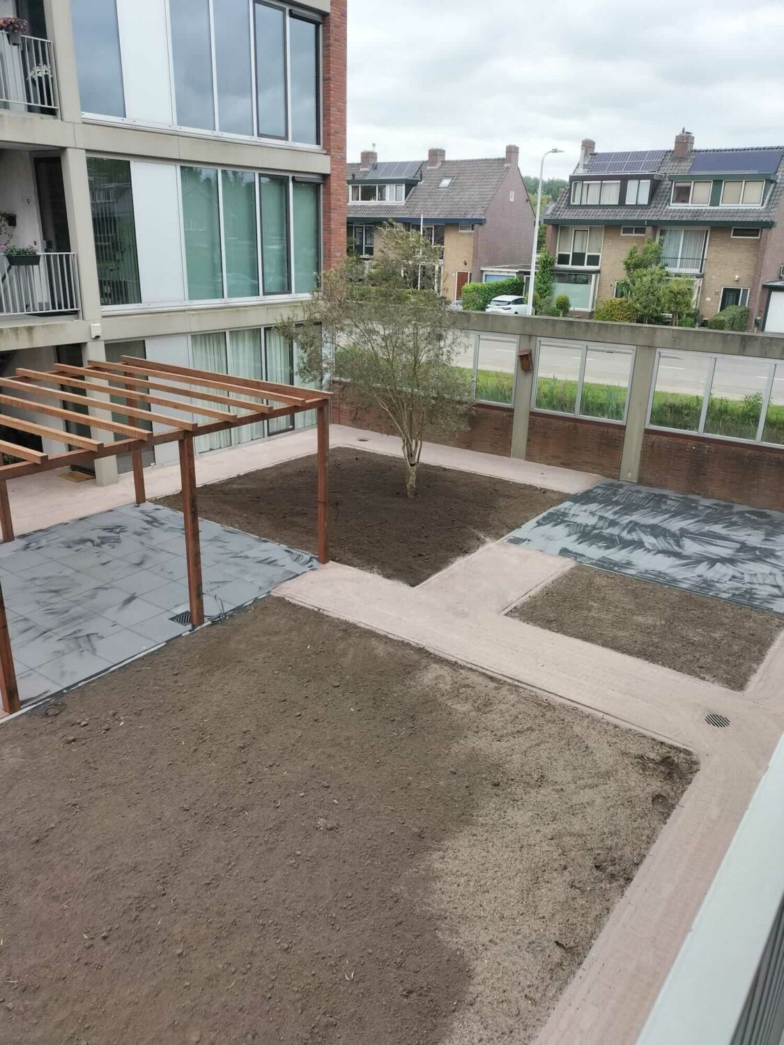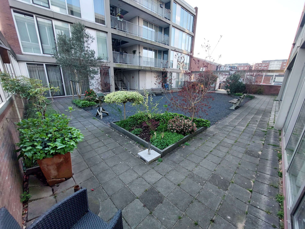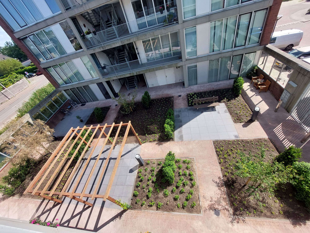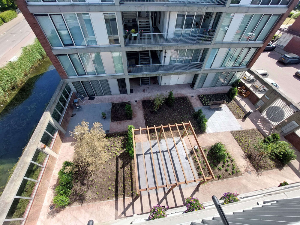 Voor een vaste opdrachtgever heeft Allgroen B.V. de binnentuin van een bestaand wooncomplex volledig gerenoveerd. De oorspronkelijke tuin was sterk verzakt en bood weinig sfeer door de overmaat aan verharding en het beperkte groen. De inrichting bestond voornamelijk uit bestrating en een groot vak met split, aangevuld met enkele kleine groenstroken.