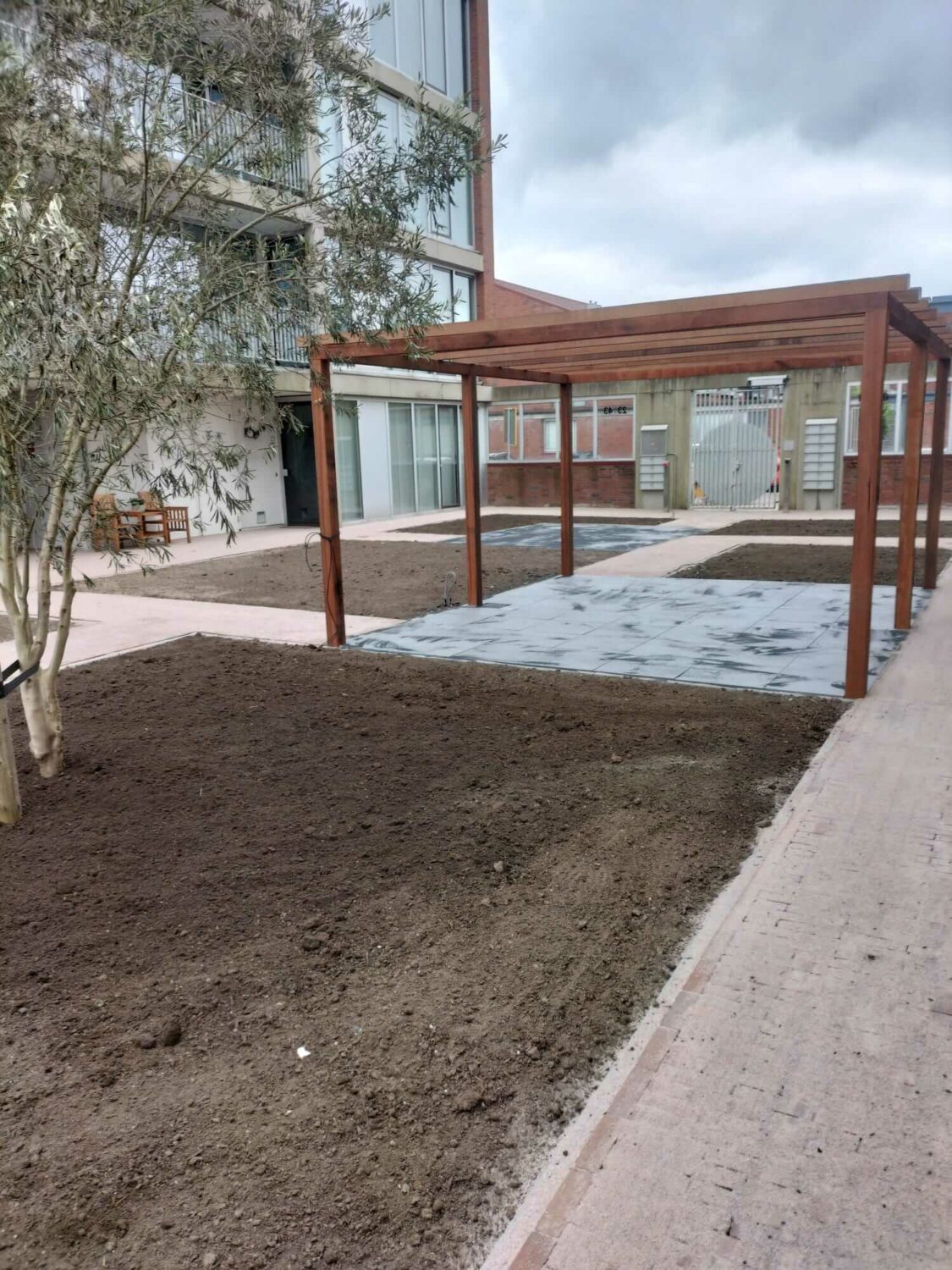 Om van de tuin weer een uitnodigende en leefbare plek te maken, is gekozen voor een complete herinrichting. Alle bestaande elementen zijn verwijderd, met uitzondering van een grote olijfboom. Deze boom is zorgvuldig behouden en heeft een centrale plaats gekregen in het nieuwe ontwerp.