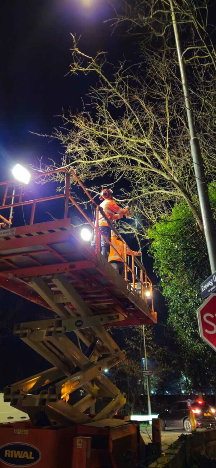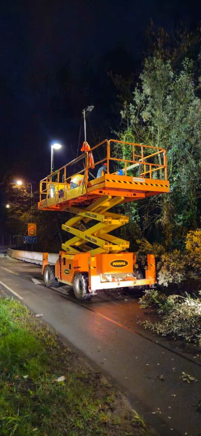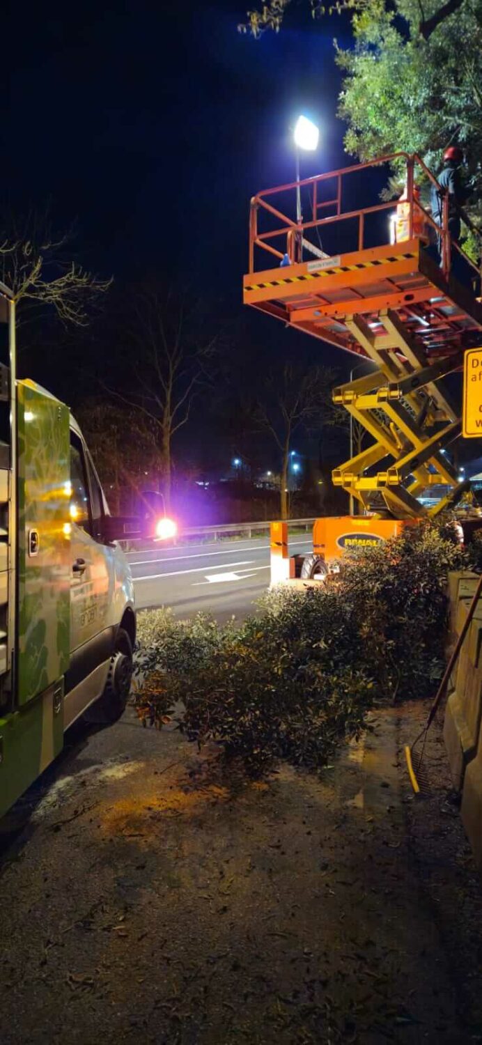 De steeneiken zijn gesnoeid met behulp van een schaarhoogwerker, uitgerust met verlichting voor optimale zichtbaarheid en veiligheid in het donker.