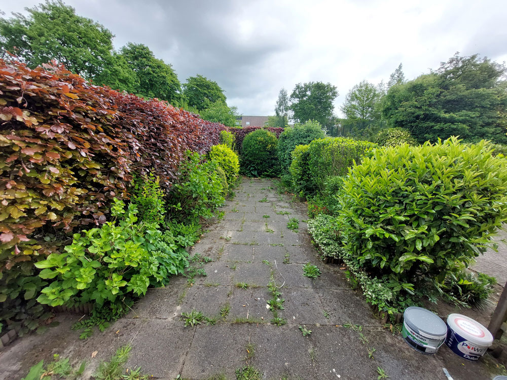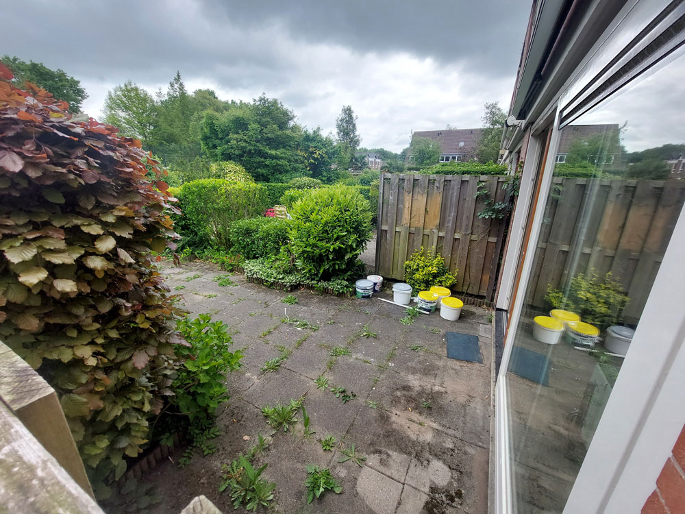 De renovatie startte met het zorgvuldig rooien van de beplanting en het verwijderen van oude verhardingen. In de achtertuin is ervoor gekozen om de bestaande bestrating grotendeels te behouden. Deze duurzame keuze sluit aan bij de milieubewuste visie van Allgroen B.V., waarbij hergebruik en het beperken van afval centraal staan. Waar nodig is het oude materiaal aangevuld met nieuwe tegels van gelijke stijl. Een gedeelte van de tuin is voorzien van kunstgras.