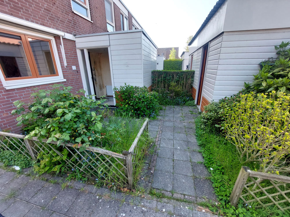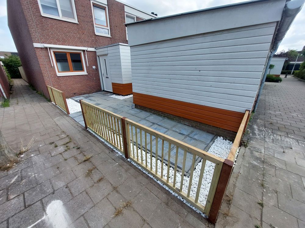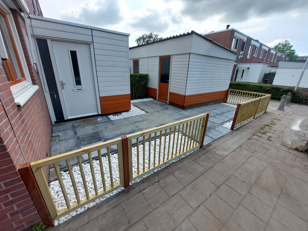 De voortuin is volledig vernieuwd. Op verzoek van de bewoner is er gekozen voor een strak en minimalistisch ontwerp. Er zijn lage hekwerken geplaatst die zorgen voor een duidelijke afbakening zonder het open karakter te verliezen. De nieuwe bestrating is aangevuld met helder wit, grof grind. Deze combinatie geeft de voortuin een frisse en moderne uitstraling die perfect past bij de woning.